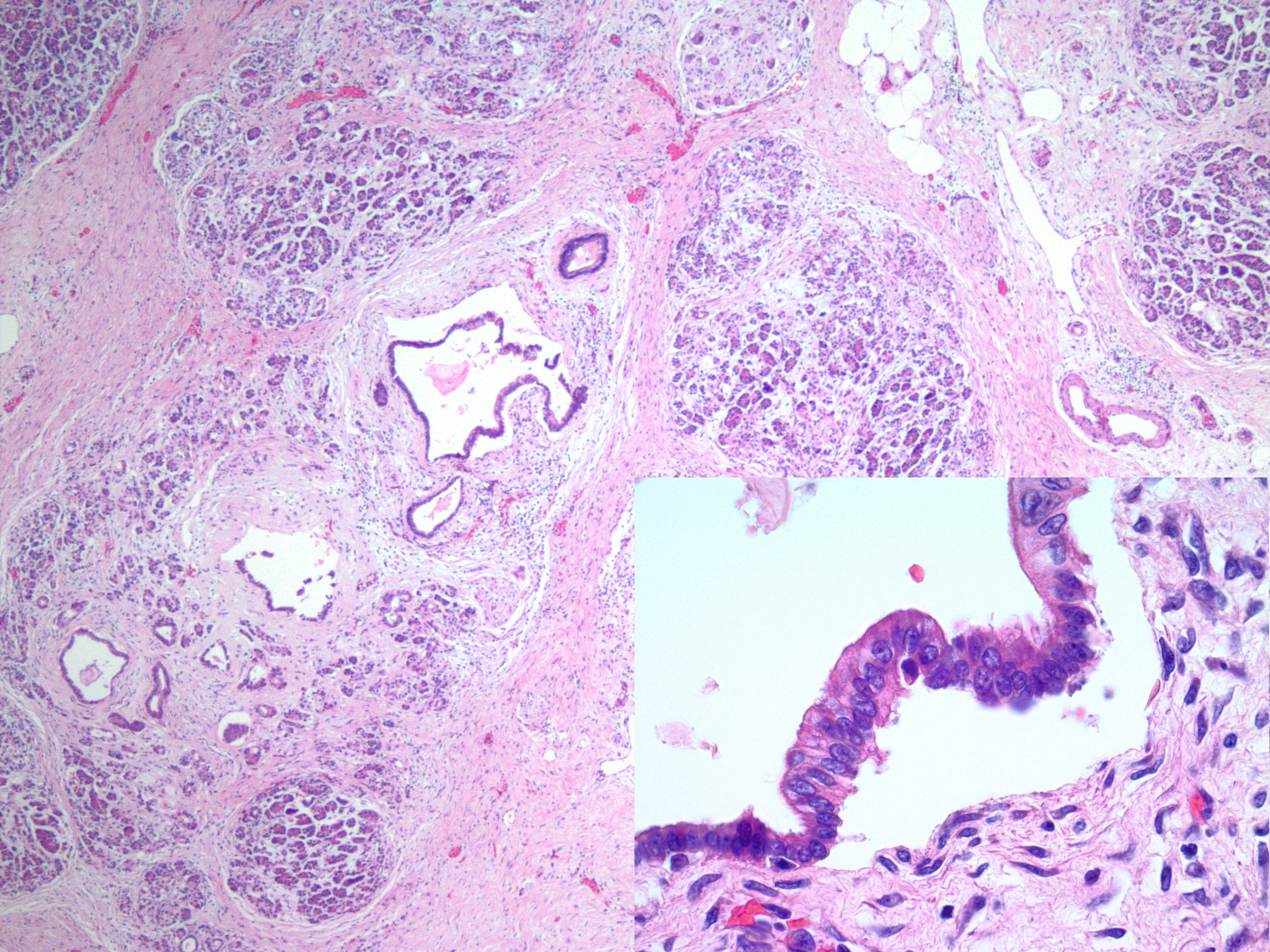 Pathologic Diagnosis: Pancreas, Whipple procedure: “Chronic and paraduodenal (“groove”) pancreatitis with cystic degeneration and acinar atrophy.”